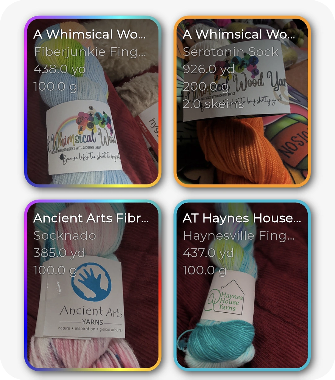 We know the challenge of keeping track of it all. Yarn Stasher helps you inventory and catalog your entire stash without typing any information. Simply take a picture of your yarn labels, and Yarn Stasher's AI automatically extracts all the details—brand, color, weight, fiber content, and yardage. Let technology do the work while you focus on what you love: creating beautiful projects.